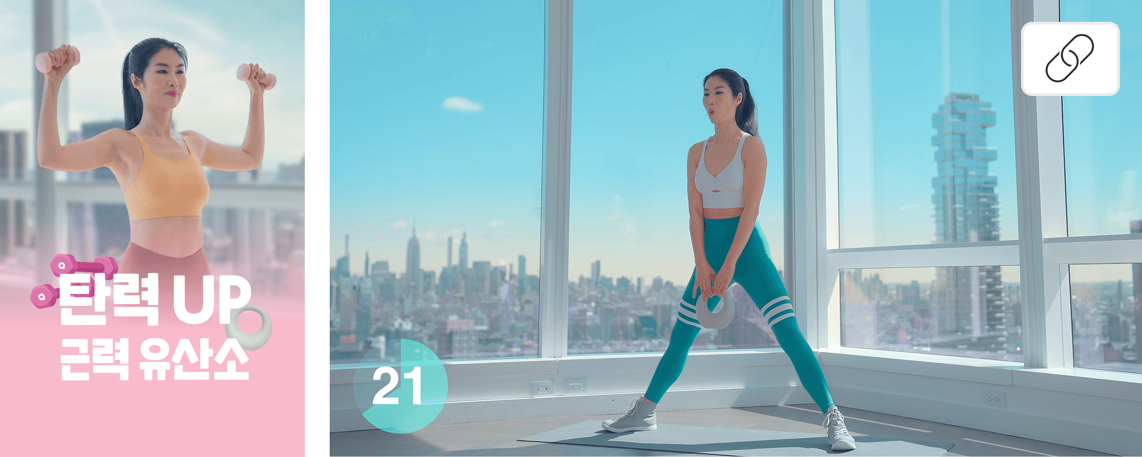 뉴욕의 활기찬 에너지를 배경으로 빅씨스 코치의 기분 좋은 목소리와 함께 진행됩니다. 덤벨과 케틀벨을 활용해 전신 근력을 더 빠르게 높일 수 있어요.